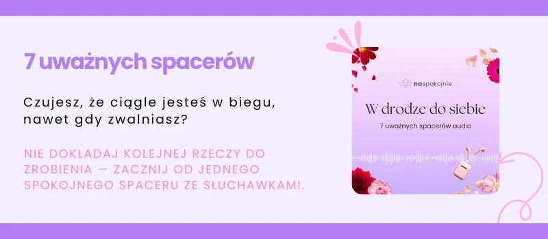 Kiedy zaczęłam traktować spacer jako przestrzeń do ćwiczenia obecności, zauważyłam subtelną zmianę. Nie próbowałam „medytować idealnie”. Po prostu zwalniałam odrobinę i kierowałam uwagę na to, co dzieje się tu i teraz.